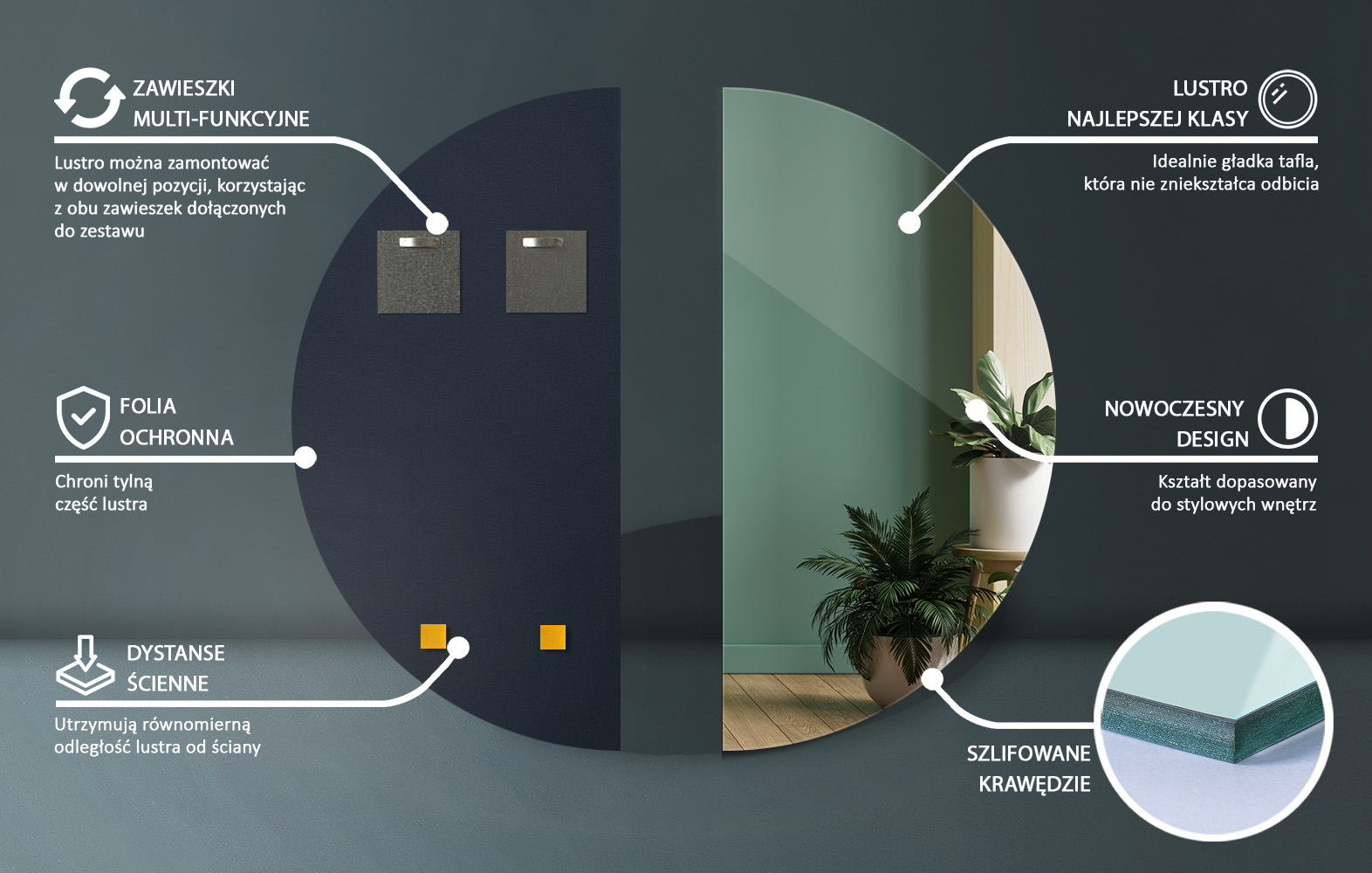 Oferowane przez nas lustro półokrągłe bez ramki w wymiarze 25x50 cm posiada minimalistyczny i nowoczesny design, który świetnie uzupełni wystrój każdego wnętrza. Można zawiesić je na ścianie w łazience, ale także w przedpokoju, salonie czy sypialni. Postaw na nowoczesne, półokrągłe lustro bez ramy jeśli szukasz dodatku do swojej aranżacji i chcesz wykorzystać wolną powierzchnię na ścianie. Lustro ma prostą i solidną konstrukcję dzięki czemu posłuży przez długie lata. Lustra półokrągłe wykonujemy w kilku różnych rozmiarach, aby ułatwić ich dopasowanie do Państwa potrzeb.